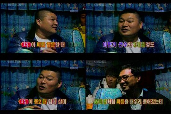 강호동은 14일 오후 방송된 KBS2 '해피선데이' 코너 '1박 2일'에서 "어렸을 때 이만기 선배님과 함께 살았던 적이 있다"고 말해 모두를 놀라게 만들었다.