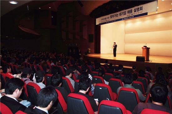 [아시아경제 이정일 기자] 전국경제인연합회와 고용노동부가 21일 부산 동의대학교에서 공동 주최한 '2011년 하반기 채용 설명회'에서 장화익 부산지방고용노동청장이 인사말을 하고 있다. 이날 설명회는 삼성, 현대자동차, SK, 롯데그룹을 대표한 5대 기업 관계자들과 500여명의 학생이 참석했다.