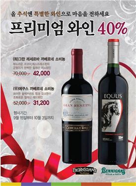 [아시아경제 오주연 기자] 베니건스는 추석을 맞아 선물용으로 제격인 프리미엄 와인 2종을 40% 할인 판매다고 26일 밝혔다.
