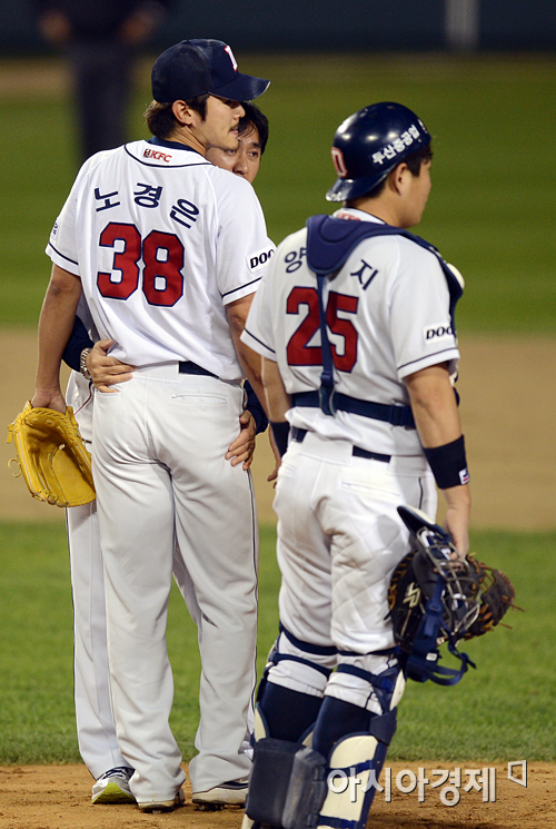 [아시아경제 정재훈 기자] 9일 오후 잠실야구장에서 열린 '2012 팔도 프로야구 준플레이오프 두산 베어스와 롯데 자이언츠의 2차전 경기 4회초 2사 1루 상황 박종윤의 타구에 맞고 고통스러워하고 있다.