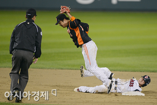 [아시아경제 정재훈 기자] 9일 오후 잠실야구장에서 열린 '2012 팔도 프로야구 준플레이오프 두산 베어스와 롯데 자이언츠의 2차전 경기 5회말 2사 1루 상황에서 폭투를 틈타 도루에 성공했던 김재호가 오버런으로 태그아웃당하고 있다.