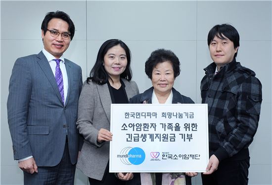 [아시아경제 김보경 기자] 한국먼디파마(대표 이종호)는 23일 소아암환자 가족을 돕기 위한 희망나눔기금 500만원을 한국소아암재단에 기부했다.