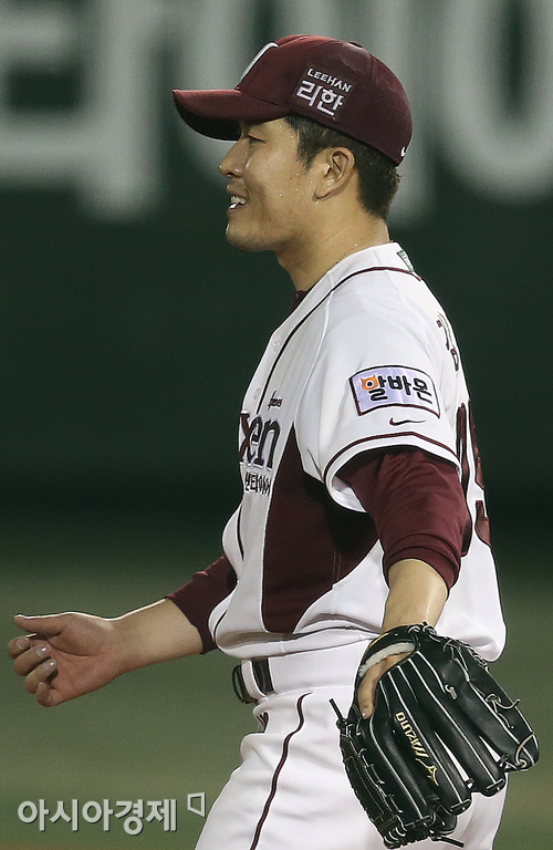 [아시아경제 정재훈 기자] 5일 오후 서울 목동야구장에서 열린 '2013 한국야쿠르트 세븐프로야구' 넥센 히어로즈와 삼성 라이온즈의 경기. 넥센 선발투수 김병현이 5회초 무사 만루 위기 상황에서 이승엽, 최형우를 삼진아웃 시키고 채태인을 범타로 처리한 뒤 미소를 짓고 있다.
