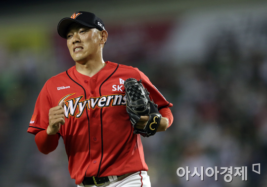 [아시아경제 정재훈 기자] 28일 오후 서울 잠실야구장에서 열린 '2013 한국야쿠르트 세븐프로야구' LG 트윈스와 SK 와이번스의 경기. SK 박정배가 6회말 2사 2, 3루 상황 이병규를 스트라이크 낫아웃으로 처리한 뒤 덕아웃으로 향하고 있다.