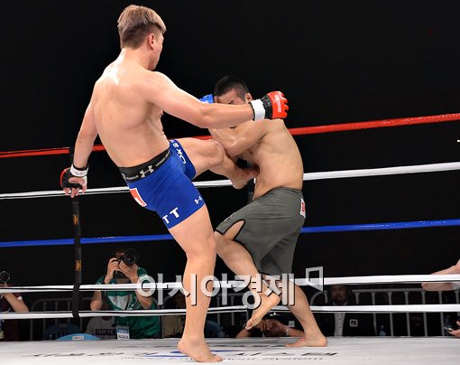 [아시아경제 송재원 기자] 양동이, 김재영 선수가 29일 오후 서울 강서구 화곡동 KBS스포츠월드에서 열린 신생 종합격투기 대회 ‘TOP FC 1- Original’에서 미들급 매치를 갖고 있다.