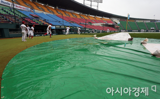 [아시아경제 정재훈 기자] 12일 오후 서울 잠실야구장에서 열릴 예정이었던 '2013 한국야쿠르트 세븐 프로야구' 두산 베어스와 KIA 타이거즈의 경기가 우천으로 취소됐다. KIA 선수들이 러닝 훈련을 하고 있다.