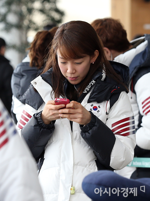 [인천=아시아경제 정재훈 기자] 프랑스 퐁 로뮤로 전지훈련을 떠나는 쇼트트랙 조해리가 22일 오전 인천국제공항에서 출국에 앞서 지인에게 메세지를 보내고 있다.