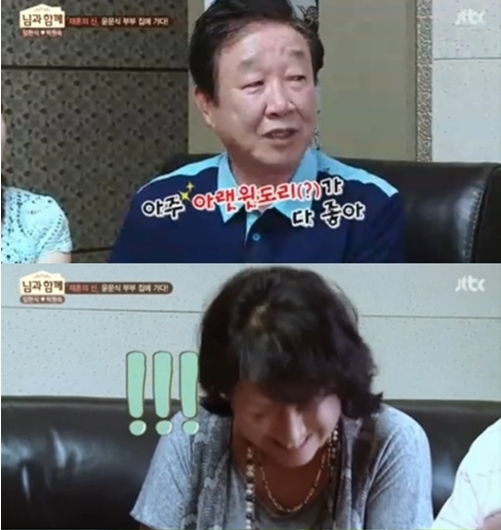 윤문식은 "결혼하니 아래 윗도리가 다좋아"라고 당황스러운 질문을 했고, 이에 어찌할 바를 모르던 박원숙은 "괜히 뜨거운 거 아랫도리에 다 쏟겠다"고 말하며 웃음을 자아내다.