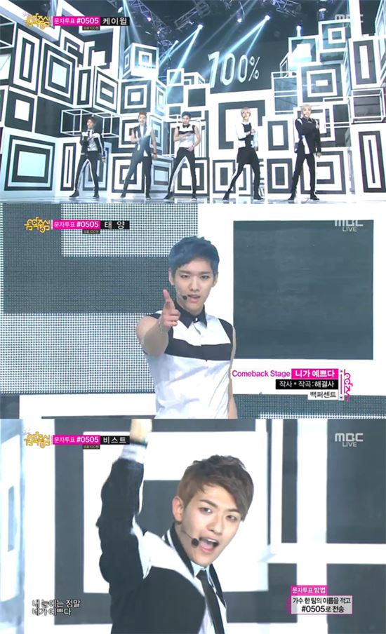 백퍼센트는 5일 오후 방송한 MBC '쇼! 음악중심'에 출연해 신곡 '니가 예쁘다'의 컴백 무대를 선보였다. 이날 멤버들은 블랙과 화이트의 조화가 돋보이는 의상을 입고 무대에 올랐다.