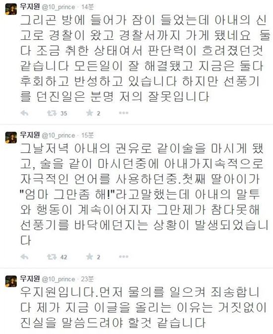 가정폭력 혐의 우지원, 트위터 해명…선풍기 집어던진 이유는?