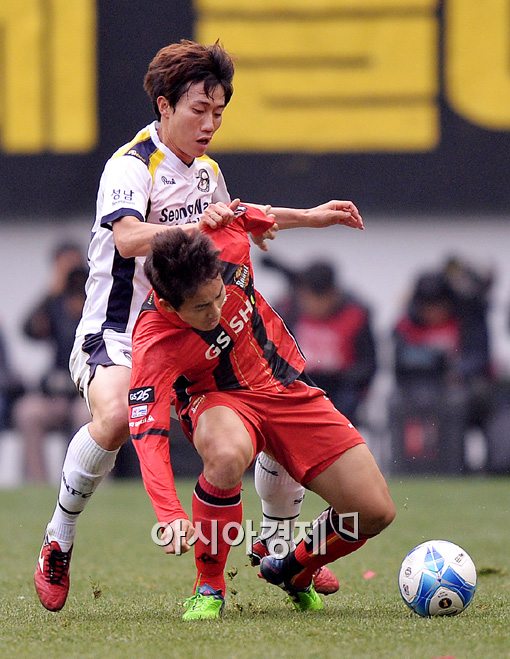 [아시아경제 김현민 기자] 프로축구 FC서울과 성남FC의 2014 하나은행 FA컵이 결승이 23일 서울월드컵경기장에서 열렸다. 성남 정선호와 서울 이웅희가 볼을 다투고 있다.