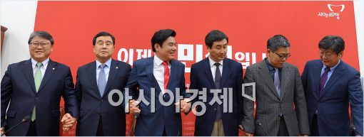 [아시아경제 윤동주 기자] 원유철 새누리당 원내대표와 이종걸 새정치민주연합 원내대표가 8일 국회에서 열린 3+3 여야 원내지도부 회동에 참석, 손을 맞잡고 포즈를 취하고 있다. 조원진 새누리당 원내수석부대표(왼쪽부터), 김정훈 새누리당 정책위의장, 원유철 새누리당 원내대표, 이종걸 새정치민주연합 원내대표, 최재천 새정치민주연합 정책위의장, 이춘석 새정치민주연합 원내수석부대표.