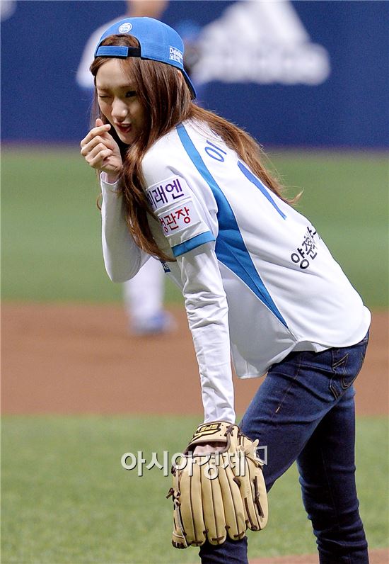 [고척=아시아경제 김현민 기자] 2015 희망더하기 자선 야구대회가 6일 고척스카이돔에서 열렸다. 배우 이성경이 시구를 하고 있다.