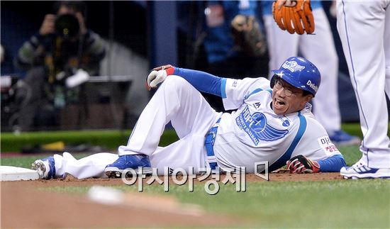[고척=아시아경제 김현민 기자] 2015 희망더하기 자선 야구대회가 6일 고척스카이돔에서 열렸다. 양신 팀 박철민이 1타점 3루타를 치고 출루하고 있다.