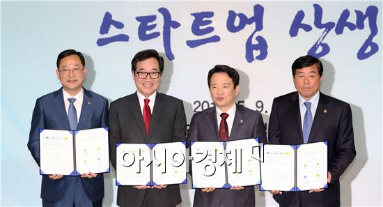이낙연 전남도지사와 남경필 경기도지사가 9일 오전 경기도 판교테크노밸리 스타트업캠퍼스에서 교육ㆍ기업ㆍ농업ㆍ청소년 교류ㆍ태양광 발전소 건립 등 9개 사업에 대한 전남도ㆍ경기도 상생협력 협약을 체결한 뒤 취재진에 포즈를 취하고 있다. (왼쪽부터) 명현관 전남도의회 의장, 이낙연 전남지사, 남경필 경기지사. 윤화섭 경기도의회 의장. 사진제공=전남도
