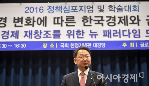 [아시아경제 윤동주 기자] 유일호 경제부총리 겸 기획재정부 장관이 12일 서울 여의도 국회에서 열린 '글로벌 금융학회'에 참석, 기조연설을 하고 있다.
