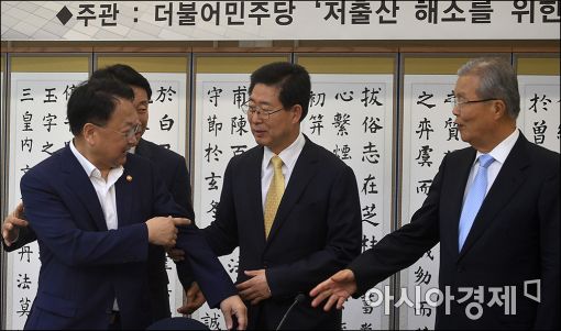 [아시아경제 윤동주 기자] 유일호 경제부총리 겸 기획재정부 장관이 13일 서울 여의도 국회에서 열린 '양극화와 저출산 해소를 위한 정책협의'에 참석, 김종인 더불어민주당 대표와 인사를 나누고 있다.
