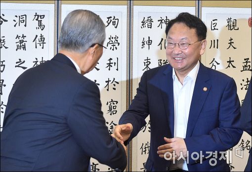 [아시아경제 윤동주 기자] 유일호 경제부총리 겸 기획재정부 장관이 13일 서울 여의도 국회에서 열린 '양극화와 저출산 해소를 위한 정책협의'에 참석, 김종인 더불어민주당 대표와 인사를 나누고 있다.