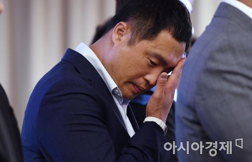 [아시아경제 김현민 기자]한국프로야구선수협회가 8일 서울 리베라호텔에서 승부조작 관련 긴급 기자회견을 열어 야구팬들에게 사과하고 재발 방지를 약속했다. 삼성 주장 박한이가 기자회견 중 땀을 닦고 있다.