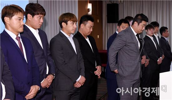 [아시아경제 김현민 기자]한국프로야구선수협회가 8일 서울 리베라호텔에서 승부조작 관련 긴급 기자회견을 열어 야구팬들에게 사과하고 재발 방지를 약속했다. 이호준 회장을 비롯한 10개 구단 주장들이 기자회견을 하고 있다.