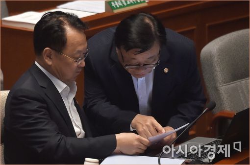 [아시아경제 윤동주 기자] 유일호 경제부총리 겸 기획재정부 장관이 16일 국회에서 열린 추경안 심사를 위한 예결위 전체회의에서 이동필 농림부 장관과 이야기를 나누고 있다.