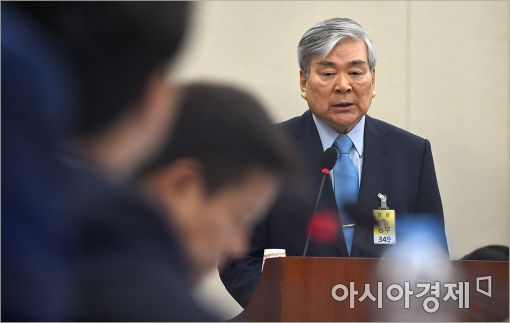 [아시아경제 윤동주 기자] 조양호 한진그룹 회장이 4일 국회 정무위원회의 산업은행 등에 대한 국정감사에 증인신분으로 출석, 의원들 질의에 답변하고 있다.