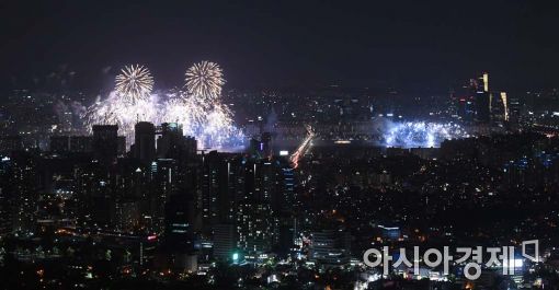 [아시아경제 백소아 기자] 2016 서울세계불꽃축제가 열린 8일 서울 중구 남산에서 바라본 서울 하늘에 화려한 불꽃들이 터지고 있다.