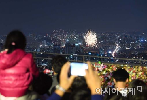 [아시아경제 백소아 기자] 2016 서울세계불꽃축제가 열린 8일 서울 중구 남산에서 바라본 서울 하늘에 화려한 불꽃들이 터지고 있다.