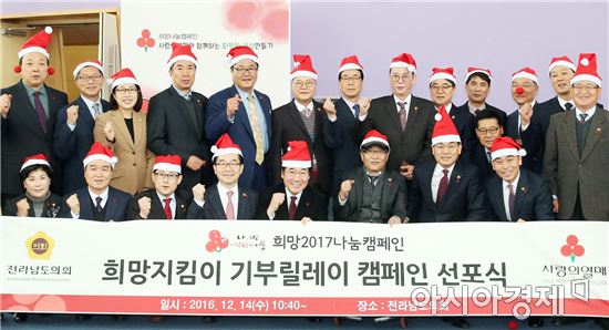 [아시아경제 노해섭 기자]‘희망 2017 나눔 캠페인, 희망지킴이 기부릴레이 선포식’이 14일 오전 전남도의회에서 열린 가운데 이낙연 전남지사, 이장석·권욱 부의장을 비롯한 도의원들이 기부함에 성금을 넣은 후 기념촬영하고 있다.