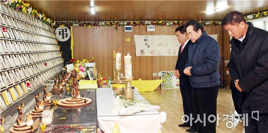 [아시아경제 노해섭 기자]이낙연 전남지사가 23일 오전 진도 팽목항 세월호 분향소를 찾아 헌화·분향한 뒤 묵념하고 있다.