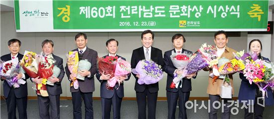 [아시아경제 노해섭 기자]이낙연 전남지사가 23일 오전 도청 서재필실에서 열린 제60회 전라남도 문화상 시상식에서 문학ㆍ예술부문별 전라남도 문화상을 시상한 뒤 기념촬영을 하고 있다. (왼쪽부터) 시인 박형동, 소설가 송하훈, 서양화가 김선영, 서예가 강수남, 이낙연 전남지사, 음악가 김연주, 연극인 강대흠, 무용인 박수경.