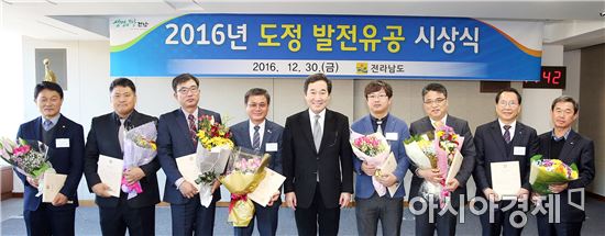 [아시아경제 노해섭 기자]이낙연 전남지사는 30일 도청 서재필실에서 도정유공자를 시상하고 격려했다. 섬 휴대전화 난청 해소, 산업평화, 숲 속의 전남, 재난대책, 도정홍보 등에서 성과를 낸 유공자 등 19명을 표창했다.