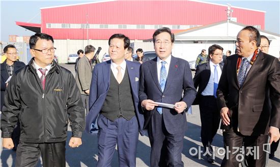 이낙연 전남지사가 3일 오후 광양항 서측 배후단지 (주)물류명가를 방문, 김성열 대표(왼쪽)로부터 우드펠릿, 곡물, 사료, 종이 등 물류현황에 대해 설명을 듣고 있다.