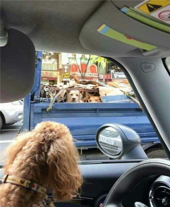사진에는 트럭에 실려 어딘가로 끌려가고 있는 반려견이 맞은편 자가용 안 운전자석에 앉아 한가로이 창밖 풍경을 바라보던 반려견과 마주친 장면이다. 특히 철창에 갇혀 맞은편 반려견을 바라보는 백구의 눈빛이 보는 이의 마음을 아프게 하고 있다.