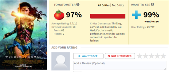 31일 로튼토마토에 따르면 ‘원더우먼’은 총 68개의 리뷰가운데 66개가 압도적인 호평이다. 슈퍼히어로 장르로서는 이례적이다.