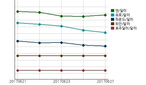 6월 27일 12시 현재 국제시장환율은 달러/유로 환율은 전일대비 0.16%(0.0018달러) 오른 1유로에 1.1211달러이고, 달러/영국 파운드 환율은 전일대비 0.14%(0.0019달러) 오른 1파운드에 1.2737달러이고, 중국 위안/달러 환율은 전일대비 0.05%(0.0039위안) 오른 1달러에 6.8406위안이고, 일본 엔/달러 환율은 전일대비 0.08%(0.0900엔) 오른 1달러에 111.3700엔이다