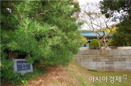 현충사 경내 위치한 박정희 대통령 기념식수. 박정희 대통령은 1970년 12월8일 현충사에 방문, 일본 특산종 금송을 기념식수 했다. 금송은 일본에서만 자라는 일본 특산종이다. [사진=문화재제자리찾기 제공]