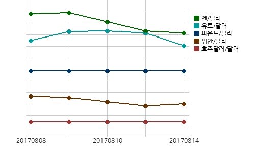 8월 14일 12시 현재 국제시장환율은 달러/유로 환율은 전일대비 0.25%(0.0030달러) 오른 1유로에 1.1821달러이고, 달러/영국 파운드 환율은 전일대비 0.24%(0.0032달러) 오른 1파운드에 1.3009달러이고, 중국 위안/달러 환율은 전일대비 0.00%(0.0006위안) 오른 1달러에 6.6616위안이고, 일본 엔/달러 환율은 전일대비 0.00%(0.0100엔) 오른 1달러에 109.1900엔이다