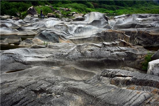 오솔길 나뭇가지 사이로 보이는 요선암은 눈이 부실 정도로 하얗다. 흐르는 물이 수만 년 세월 동안 화강암의 피부를 매끈하게 연마했기 때문이다. 요선암은 돌개구멍이 있는 너럭바위와 주변을 통틀어 부르는 말이다. 맑은 강 속에 크고 하얀 바위가 200m에 걸쳐 넓게 깔려 있다. 요선암이 동해의 무릉반석과 다른 점은 너럭바위 표면에 돌개구멍이 무수하게 패어 있다는 것이다. 포트홀(Pot Hole)로 불리는 돌개구멍은 '속이 깊고 둥근 항아리 구멍'이라는 뜻이다. 학자들은 하천에 의해 운반되던 자갈 등이 오목한 모양의 너럭바위에 들어가 소용돌이치는 강물과 함께 회전하면서 내부를 마모시켜 항아리 모양의 구멍이 생긴다고 한다. 도대체 얼마나 많은 세월이 흘러야 이런 돌개구멍들이 만들어질까?