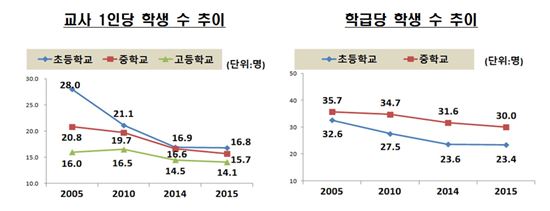 지표에 따르면 교사 1인당 학생 수(2015년 기준)는 초등학교 16.8명, 중학교 15.7명, 고등학교 14.1명으로 전년 대비 모든 학교급간에서 줄어들었다. 각각 0.1명, 0.9명, 0.4명 줄었다. 다만 OECD 평균(초 : 15.2명, 중 : 13.0명, 고 : 13.1명)보다는 소폭 많았다.
