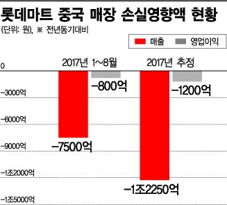 국회 산업통상자원중소벤처기업위원회 소속 김수민 국민의당 의원이 롯데로부터 받은 ‘중국의 사드보복으로 인한 롯데 피해 현황’에 따르면 롯데마트의 1~8월 중국 매출은 4100억원으로 지난해 같은 기간(1조1600억원)에 비해 64.7%인 7500억원 줄었다. 영업손실은 1450억원으로 지난해 1~8월 영업손실액인 650억원보다 800억원의 적자가 늘어났다.