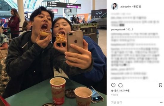 게재된 사진 속 김아랑과 곽윤기는 장난기 가득한 표정을 지으며 함께 셀카를 찍었다. 두 사람은 빵을 한입에 넣으려 입을 크게 벌린 채 사진을 찍어 웃음을 자아냈다.