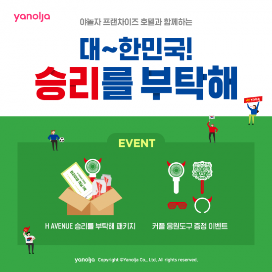 이달 말까지 '대한민국 승리를 부탁해'란 주제로 실시되는 이번 프로모션은 모든 투숙객에게 객실당 맥주 두 캔을 무료로 제공하는 등 야놀자 호텔 특별 객실 패키지 상품을 제공한다. 야놀자 애플리케이션을 통해 예약한 투숙객에게는 지점 별로 휴대용 선풍기를 선착순 증정한다.