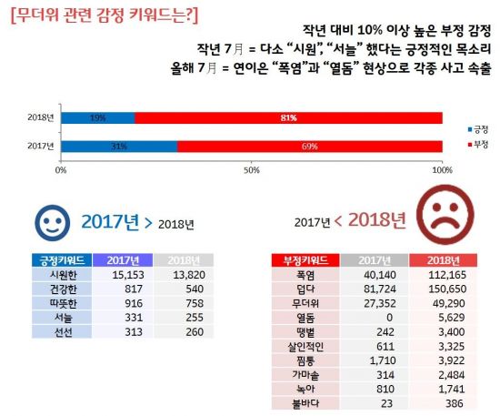 더위에 대한 인식도 부정적으로 바뀌었다. '여름을 시원하고 건강하게 나는 법' 등 여름에 대한 긍정 언급은 작년과 비슷한 수준으로 나타났다. 반면, 덥다, 폭염, 살인적인 같이 부정 키워드는 전년 대비 177% 폭증했다.