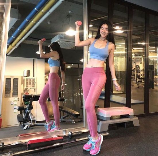 사진 속에서 서리나는 블루빛회색 탑에 분홍색 레깅스 차림으로 한 손에 분홍색 아령을 들고 서 있다. 8등신을 넘어서는 놀라운 비율이 눈길을 끈다.