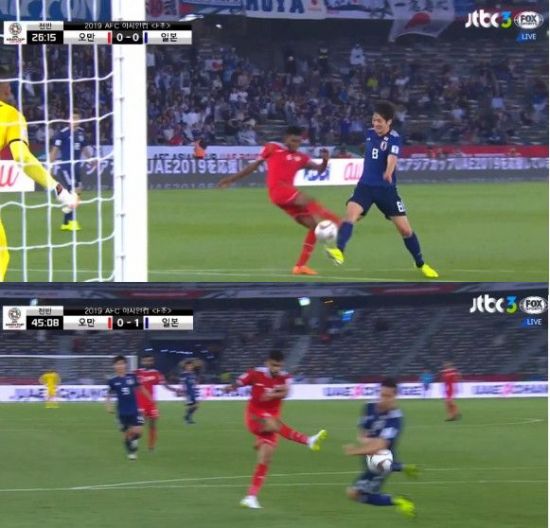전반 26분 일본의 PK상황(상단)과 전반 44분 오만의 슈팅상황/사진=JTBC 스포츠 캡처