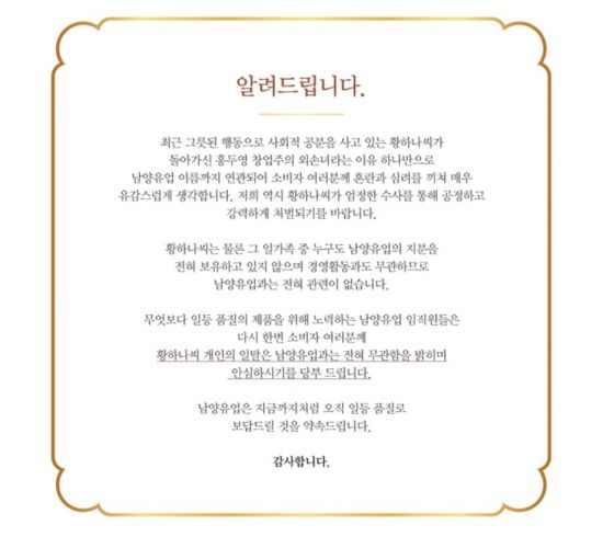 이어 "황 씨는 최근 방송과 기사를 통해 남양유업 창업주 외손녀로 널리 알려져 있지만 실제 황 씨를 비롯한 일가족들은 남양유업과 전혀 관련이 없다"며 "창업주 외손녀라는 이유만으로 남양유업 회사명이 황하나씨와 같이 언급돼 관련 종사자들이 지속적으로 피해를 입고 있다"고 호소했다.