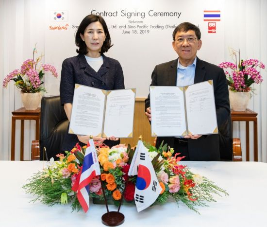 삼양식품은 최근 태국 방콕에서 수입 전문 유통기업 ‘시노 퍼시픽(Sino Pacific)'과 유통 및 판매에 관한 계약을 체결했다.(왼쪽) 삼양식품 김정수 사장, (오른쪽) 시노 퍼시픽 에카차이 싸웻쏨폽(EKACHAI SAVETSOMPHOB) 회장.