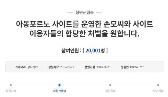 청와대 국민청원 게시판에는 '아동포르노 사이트를 운영한 손 모 씨와 사이트 이용자들의 합당한 처벌을 원합니다'라는 제목의 청원 글이 21일 게시됐다.