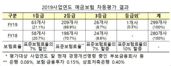 경영·재무 상태가 우수해 표준보험료율의 7%를 할인받는 1등급 금융회사는 63곳(21.1%)으로 전년(58개사, 20.7%)보다 전체에서 차지하는 비중이 커졌다.
